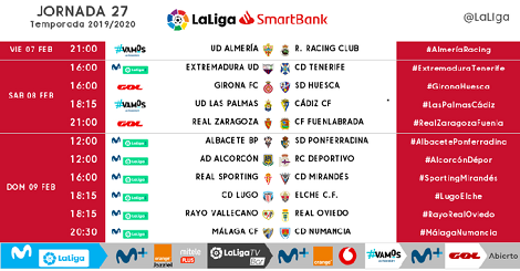 @_juanantjimenez | LaLiga ha dado a conocer el horario de la jornada 27º de LaLiga SmartBank 2019/2020, que arrancará la jornada el viernes 7 de febrero a las 21:00 horas, con un duelo entre el Almería y Racing de Santander y concluirá el domingo 9 de febrero con el partido entre el Málaga y Numancia a las 20:30 horas en el estadio La Rosaleda.