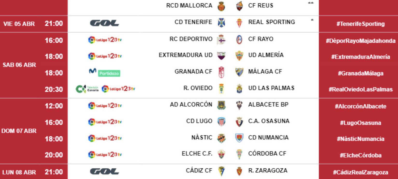 @JuanjeFernandez || LaLiga ha dado a conocer los horarios de la 33ª jornada de LaLiga 1l2l3 2018/19, que arrancará el viernes 5 de abril a las 21:00 con el CD Tenerife – R.Sporting y concluirá el lunes 8 de abril a las 21:00 horas con el choque entre Cádiz CF y R. Zaragoza. El Málaga volverá a protagonizar el partidazo de la jornada con su visita a Granada. El partido será el sábado 6 de abril a las 18h00. Un horario perfecto para que se viva el habitual buen ambiente en las gradas que lleva dando este derbi en las últimas temporadas.