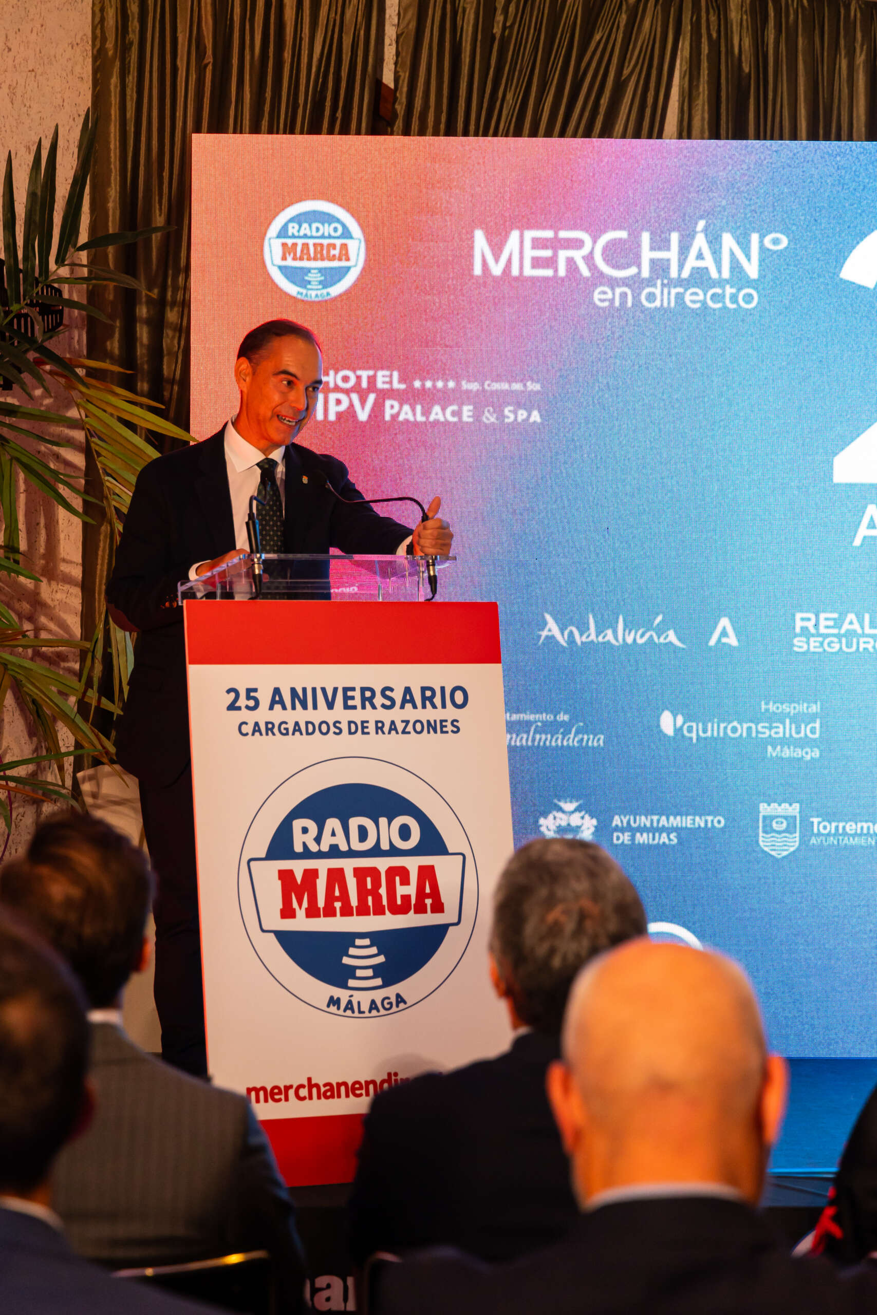 La presentación de la nueva web de Radio MARCA Málaga, uno de los grandes puntos fuertes del año del 25º aniversario de la radio del deporte, ha contado con numerosas figuras reconocidas en el hotel IPV de Fuengirola. Una de ellas ha sido la del alcalde de Benalmádena, Juan Antonio Lara. El regidor benalmadense se ha mostrado muy contado de contar con presencia en un evento de una radio que reconoce como «plural» y en la que se reconoce la «libertad de prensa». Una de las grandes curiosidades que dejó su presencia en el escenario, fue el de recordar todo el tiempo que Radio MARCA Málaga cuenta con sus estudios centrales en la localidad. «Nuestra localidad seguirá siendo vuestra casa. Ojalá estéis con nosotros durante muchos años«, aseguró Lara en su intervención.