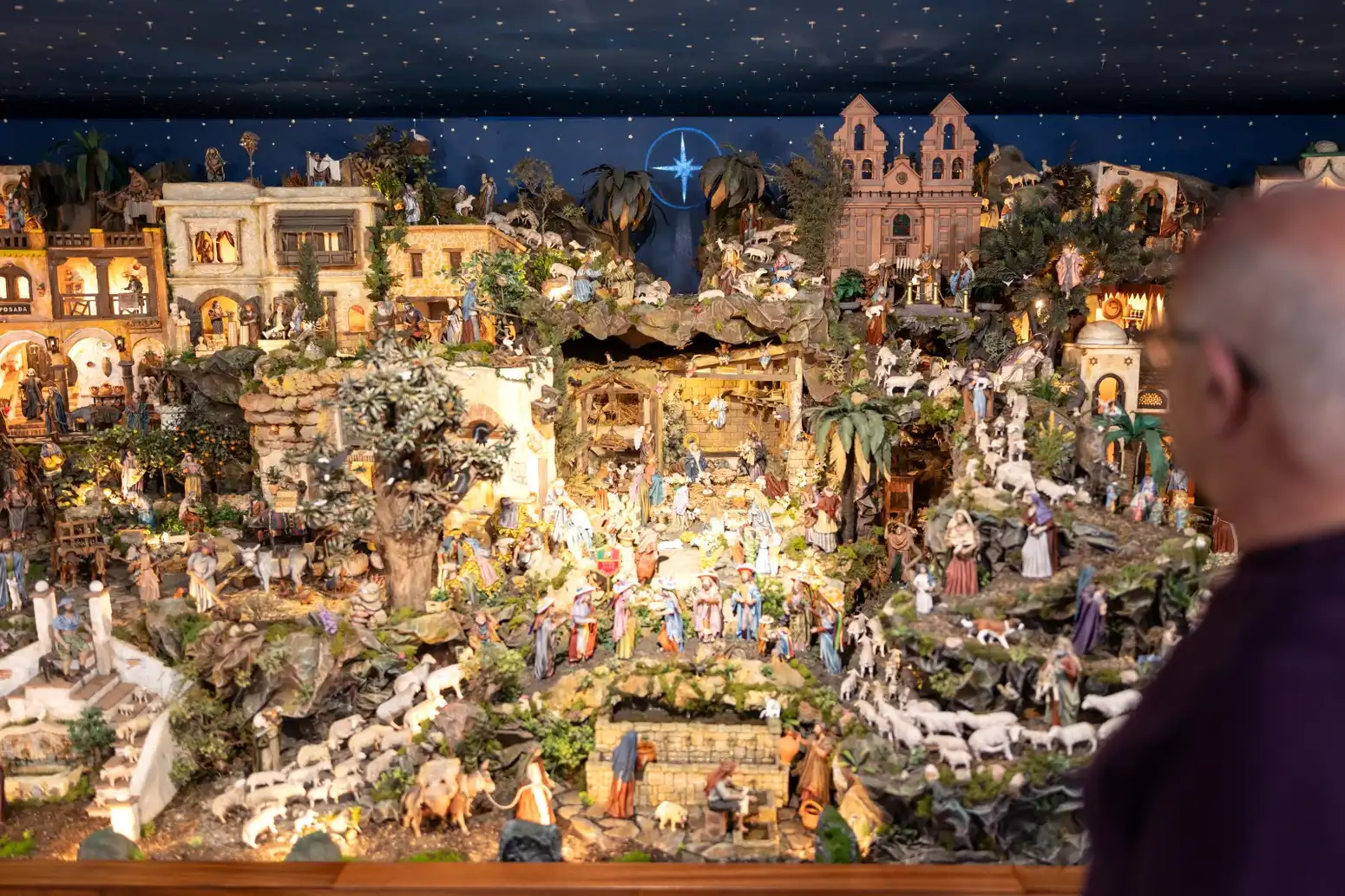 El Belén se caracteriza por reflejar las costumbres y los rincones de la provincia más significativos. La Farola y la entrada al Puerto de Málaga, el Torcal de Antequera, la Iglesia del Carmen del Perchel, escenas que hacen referencia a las costumbres malagueñas, como las figuras del biznaguero, el cenachero, el espetero de sardinas, los paseros, así como los olivos, naranjos y los balates típicos de los campos, donde se cultiva una gran diversidad de frutas y verduras, también se pueden observar en este gran Belén. Además, representa 19 escenas bíblicas, desde la Anunciación a la Virgen María hasta el regreso de la Sagrada Familia a Nazaret.