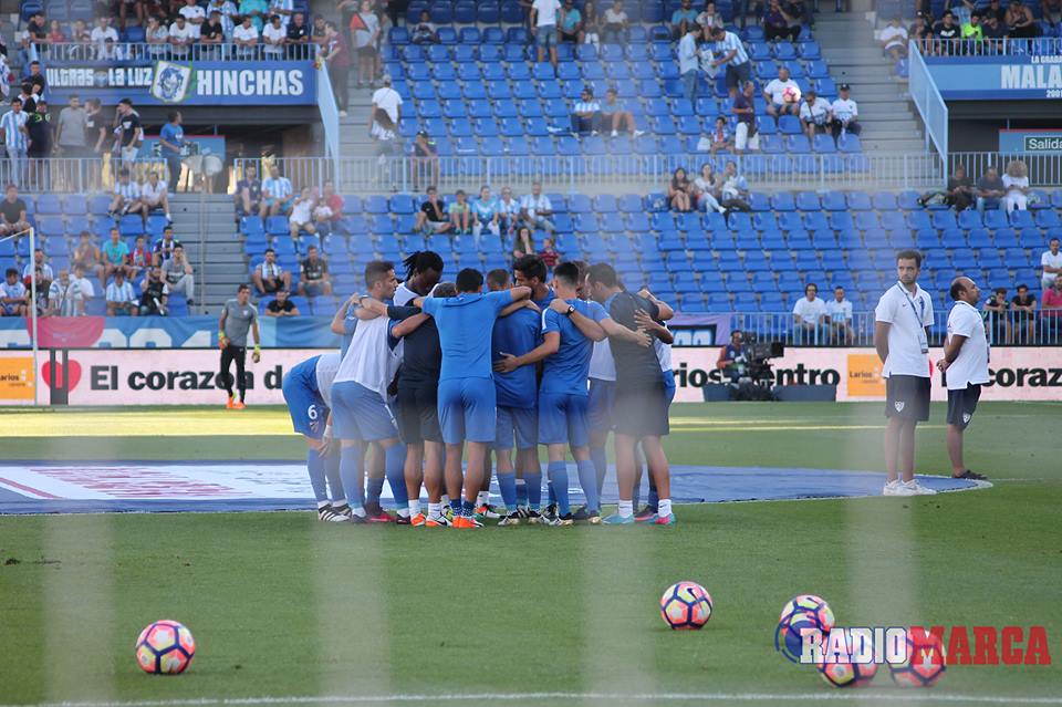 Los jugadores del Málaga forman una piña antes del duelo ante el Athletic || Jenny Lozano