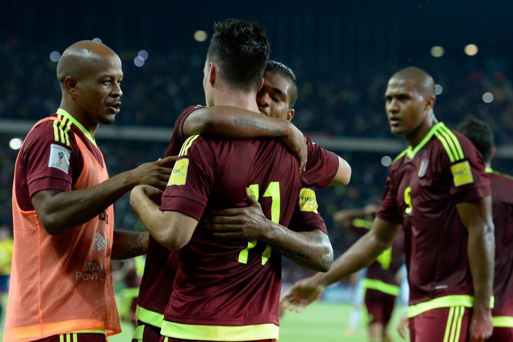 Juanpi Añor es abrazado por sus compañeros ante la mirada de Rondón
