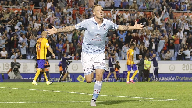 Guidetti celebra un gol con el Celta ante el Barcelona