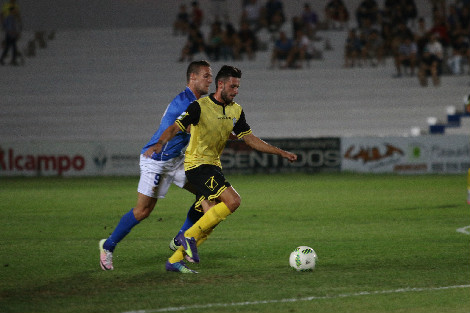 Marcos Ruiz se lleva la pelota ante un contrario en el choque ante el Linares