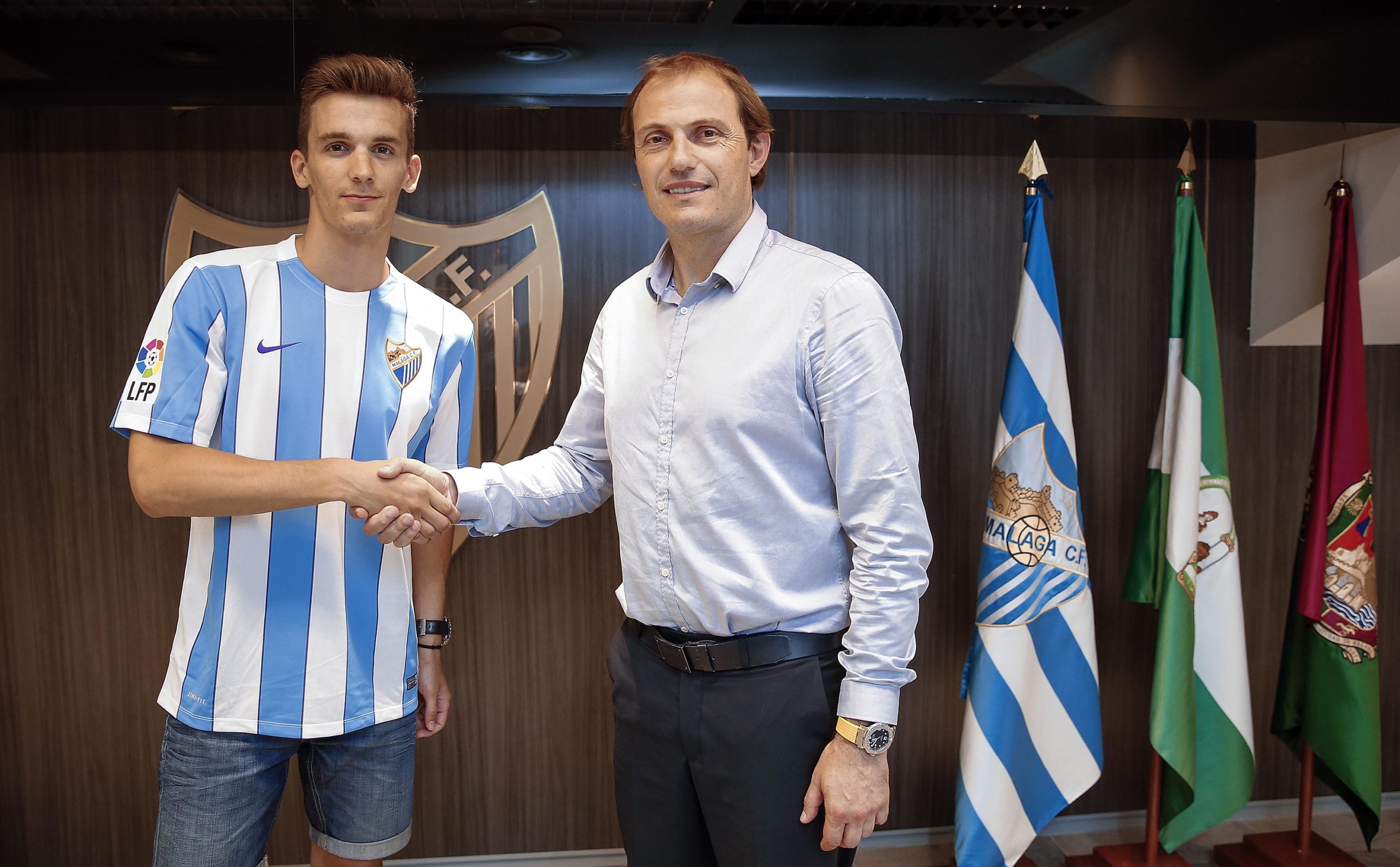 Diego Llorente, junto a Francesc Arnau, tras firmar su cesión al Málaga