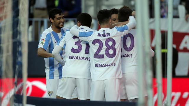 Los jugadores del Málaga celebran el tanto de Cop, el 700 del Málaga CF || laliga.es
