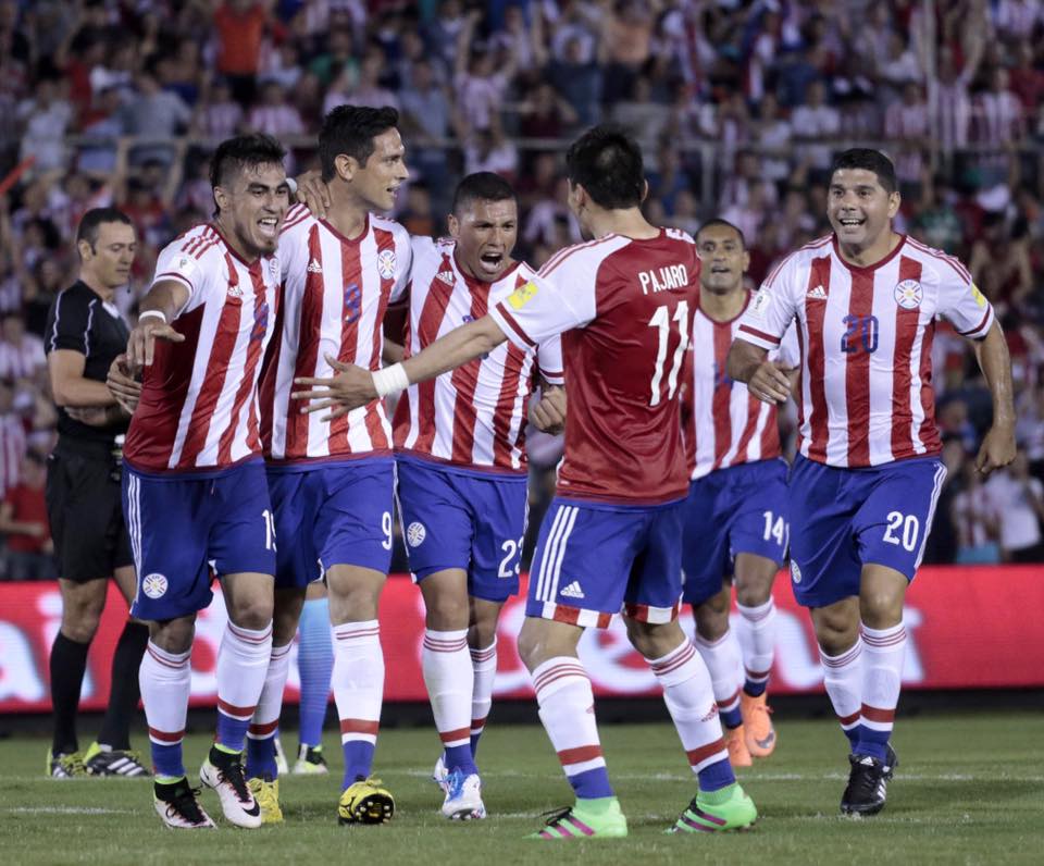 Roque Santa Cruz celebra uno de los goles de su selección en el Paraguay-Brasil