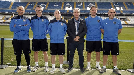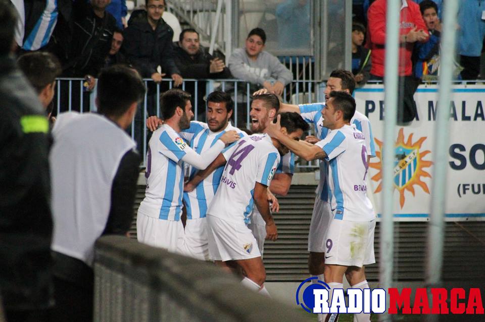 Los jugadores del Málaga celebran un gol de Cop en La Rosaleda || Jennifer Lozano