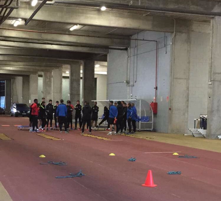 La charla previa de la plantilla y del cuerpo técnico en el interior del estadio de atletismo