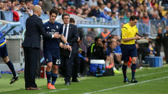 Isco, en el momento de salir del campo, felicitado por Zidane.