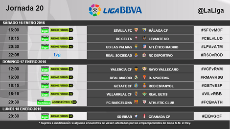 Horarios para la jornada 20 de Liga