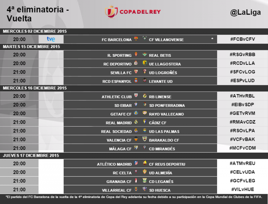 Horarios de los encuentros de vuelta de los 1/16 de la Copa del Rey