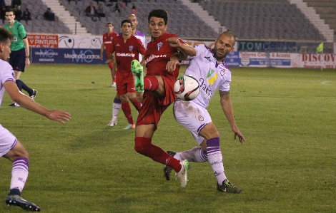 Álex Herrera, luchando por un balón dividido durante el Jaén-Marbella