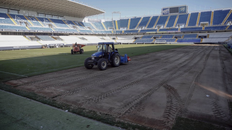 Así retiraban las máquinas el antiguo césped de La Rosaleda || malagacf.com