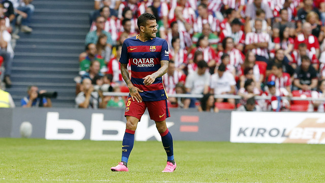 Dani Alves, doliéndose del aductor derecho, podría ser baja ante el Málaga || Miguel Ruiz