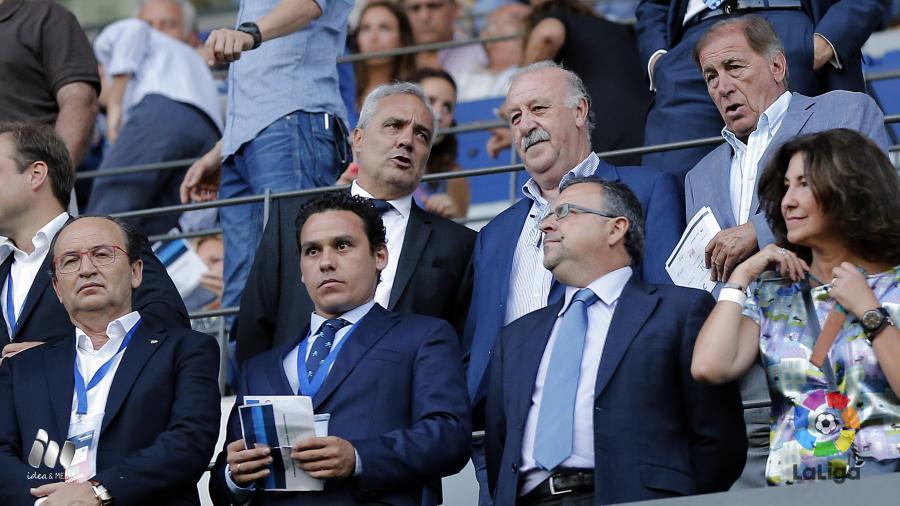 Del Bosque, en el palco de La Rosaleda, junto a Grande y a Husillos. || LaLiga