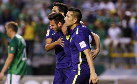 Charles, Cop y Recio celebran el gol del croata ante el Deportivo Cali