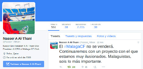 El tweet de Nasser Al Thani indicando que no se venderá el Málaga