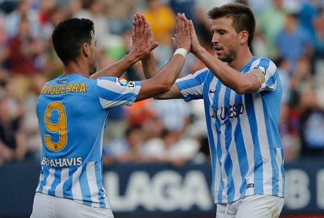 Camacho, felicitando a Javi Guerra tras marcar dos goles ante el Sevilla