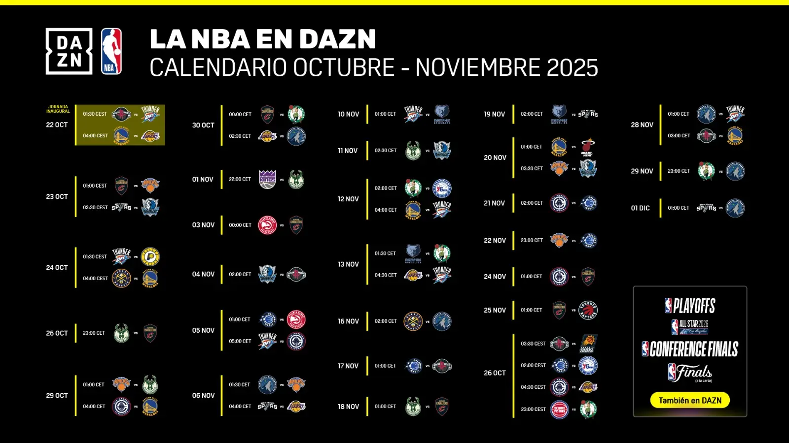 Durante las primeras semanas de la temporada, los aficionados podrán disfrutar en la plataforma de algunos de los enfrentamientos más atractivos del calendario. DAZN ofrecerá en directo partidos de franquicias históricas y nuevas potencias de la liga, con choques que prometen espectáculo como el Cleveland Cavaliers vs New York Knicks (23 de octubre, 1:00h), el San Antonio Spurs vs Dallas Mavericks (23 de octubre, 3:30h), el Boston Celtics vs Philadelphia 76ers (12 de noviembre, 2:00h) o el Denver Nuggets vs Golden State Warriors (24 de noviembre, 4:00h). Durante los meses de octubre y noviembre DAZN ofrecerá en directo más de 40 encuentros de la NBA.