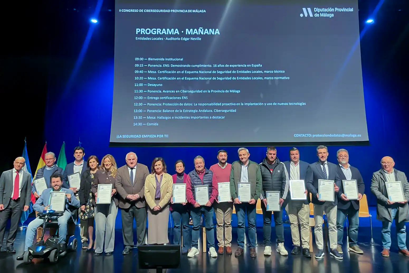 El vicepresidente de Gestión Económica Administrativa, Manuel Marmolejo, que ha inaugurado la jornada, ha hecho entrega de la Certificación en el Esquema Nacional de Seguridad (ENS) a los ayuntamientos de Cartajima, Coín, Nerja, Totalán y Villanueva del Rosario, que la han obtenido de la mano de la Diputación, y a los ayuntamientos de Fuente de Piedra, Sedella, Cútar, El Borge, Colmenar, Cuevas Bajas, Villanueva de Algaidas, Villanueva de Tapia e Istán, que lo renuevan tras obtenerlo hace dos años.