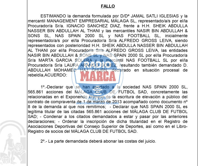 @SuarezRMarca | El fallo emitido por el titular del Juzgado de Instrucción número 12 de Málaga respecto al caso Bluebay no deja lugar a las dudas. Además de señalar en varias de sus argumentaciones que resulta "incongruente" y "difícilmente concebible la celebración de un acuerdo tan importante", como es el del traspaso de las acciones de una sociedad, "sin el conocimiento y participación del señor Al Thani", también le deja ko cuando señala que "en su interrogatorio, el Sr. Al Thani se limitó a negar el hecho o manifestar su total ignorancia, sin ofertar ninguna explicación o alegación adicional".
