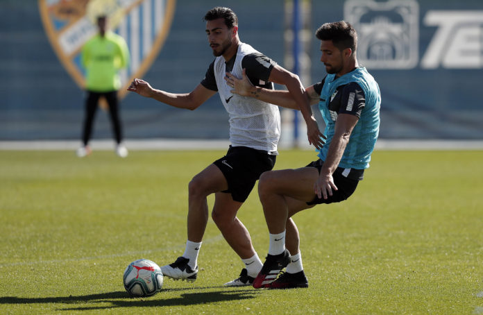 El canterano Luis Muñoz controla una pelota en un entrenamiento del Málaga CF
