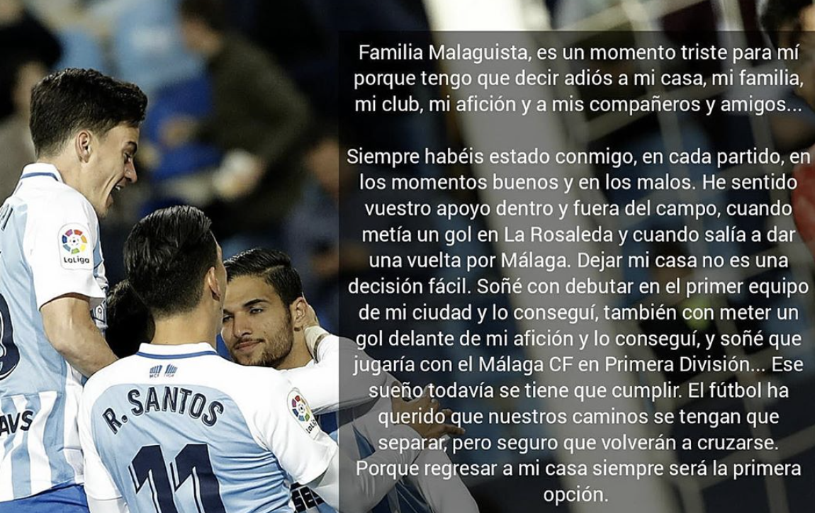 Siempre habéis estado conmigo, en cada partido, en los momentos buenos y en los malos. He sentido vuestro apoyo dentro y fuera del campo, cuando metía un gol en La Rosaleda y cuando salía a dar una vuelta por Málaga. Dejar mi casa no es una decisión fácil. Soñé con debutar en el primer equipo de mi ciudad y lo conseguí, también con meter un gol delante de mi afición y lo conseguí, y soñé que jugaría con el Málaga CF en Primera División… Ese sueño todavía se tiene que cumplir. El fútbol ha querido que nuestros caminos se tengan que separar, pero seguro que volverán a cruzarse. Porque regresar a mi casa siempre será la primera opción.