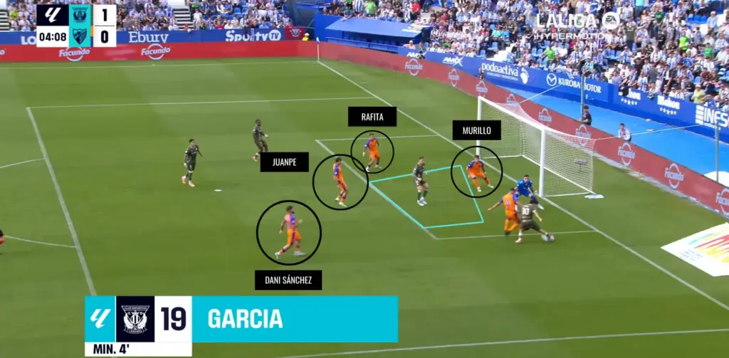 Tras el gol, el Málaga se impone con una posesión estéril (definido así por el propio Sergio Pellicer). Más allá de la ocasión fallada por Larrubia en el minuto 11, que habría cambiado el partido por completo, el equipo malaguista solo chutó dos veces a puerta en la primera parte. El único jugador que fue capaz de dar un paso adelante fue Juanpe, quien rompió líneas y generó ante un Leganés que defendió cómodo en un bloque medio-bajo aprovechando la amenaza de Duk y Juan Cruz a las espaldas.