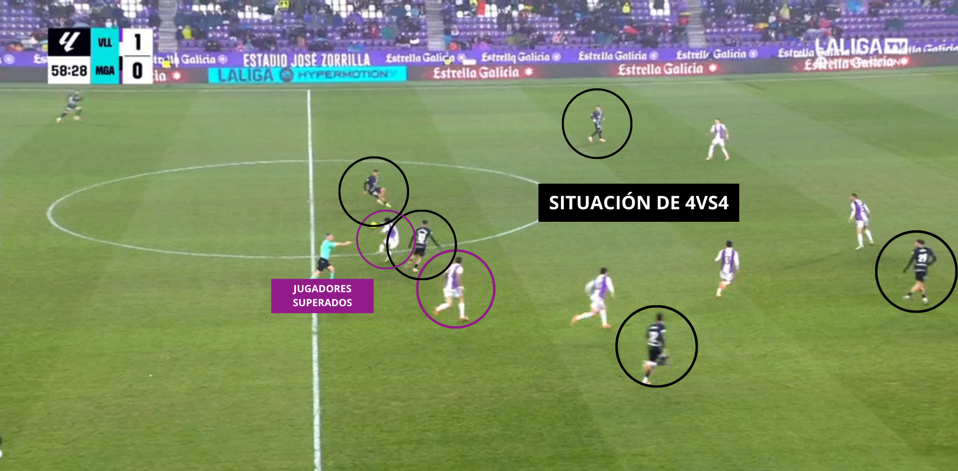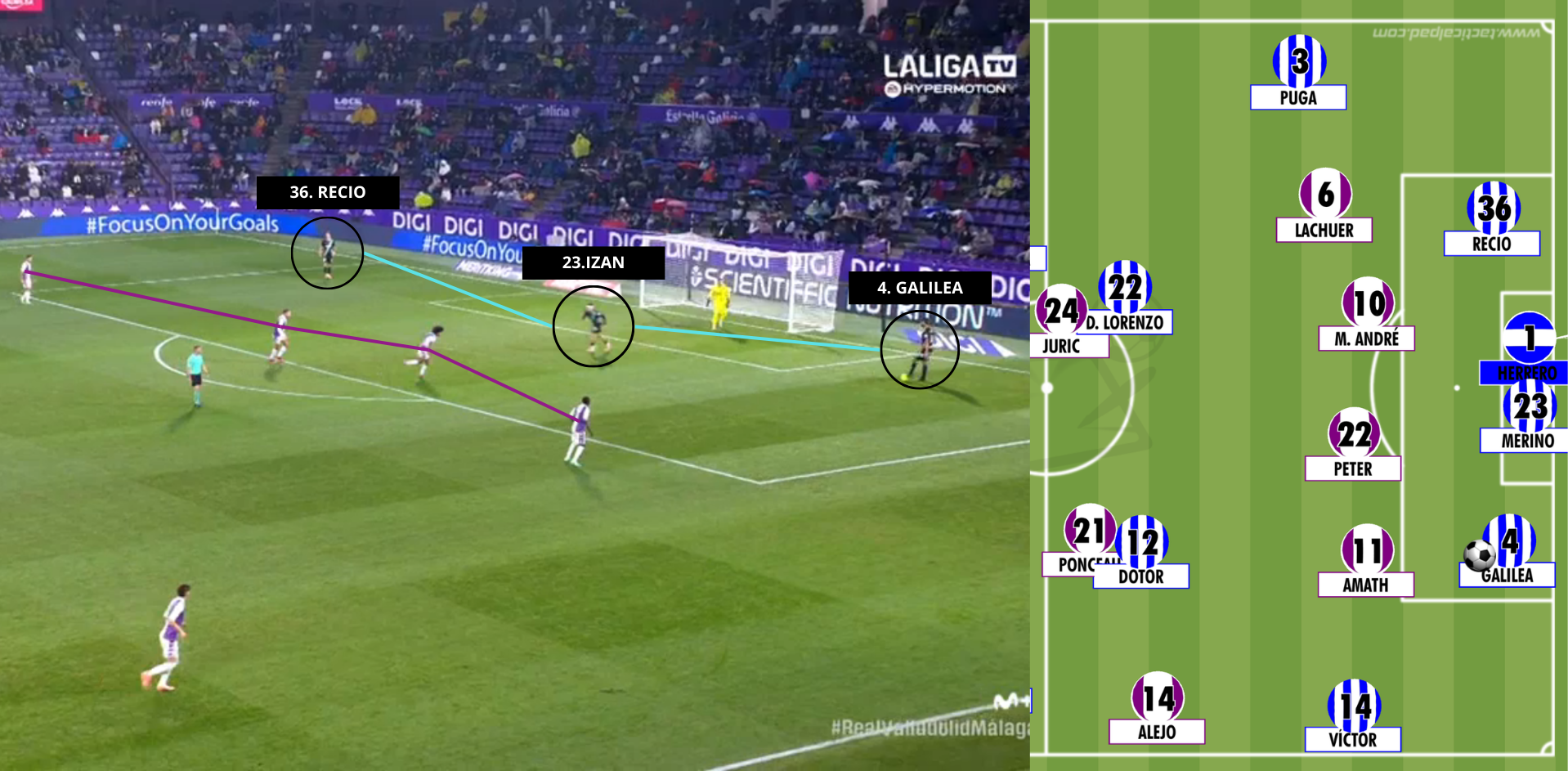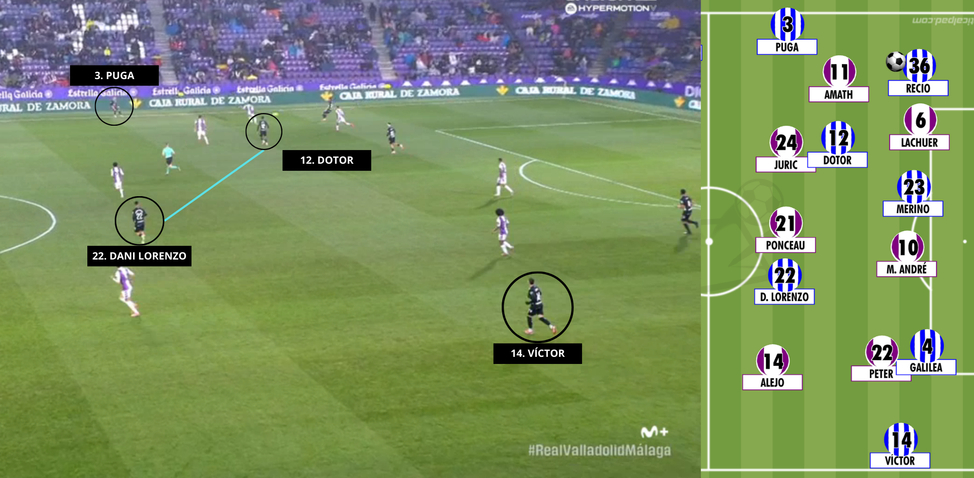 A Puga le beneficia mucho un sistema que deja a los laterales con mucho recorrido y con mucha libertad. No tanto a Víctor, a pesar de dejar una buena sincronía con Dani Lorenzo. Pero los nombres clave son los interiores. Dotor y Dani Lorenzo son los compañeros perfectos para que tanto Izan como los otros centrales, puedan encontrarlos por dentro para, a través de una pared, un giro o una conducción, superen al rival. Tras un movimiento exitoso se genera la superioridad y el Málaga se planta en campo rival con la intención de amenazar, si los extremos estuviesen al nivel de sus compañeros.