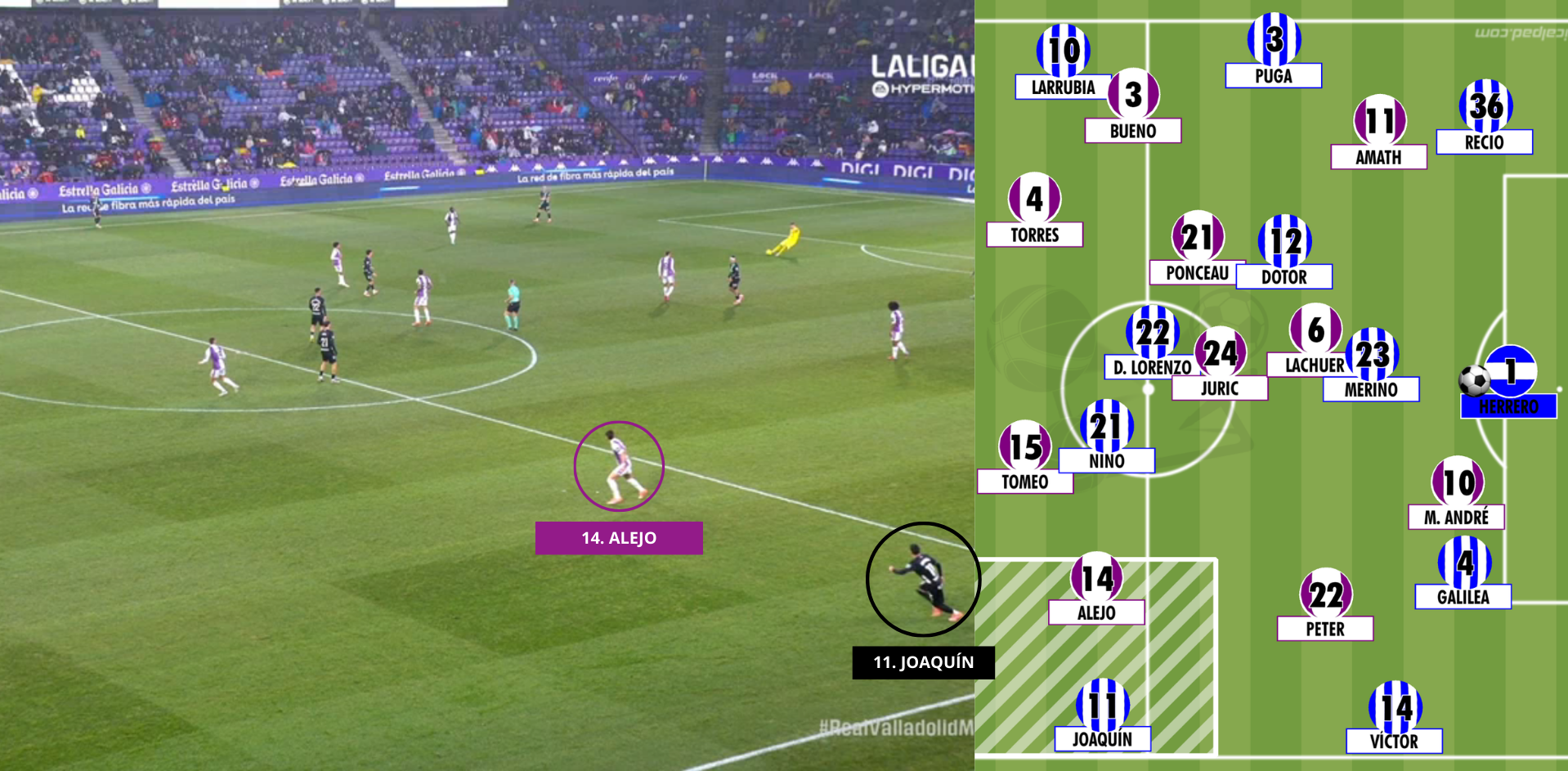 Se puede ver mucho como el Málaga, cuando Alfonso tiene balón controlado, se junta y deja a los extremos y al delantero en uno para uno. Por ejemplo, así llegó el segundo gol de Niño contra el Mirandés. Tras un pase largo del portero que brega Joaquín y acaba cazando Niño. Los compañeros atraen para poder generarles situaciones en las que no se busca ganar directamente el balón largo, si no también la posible segunda jugada. 16 y 14 pases largo intentó el toledano ante Mirandés y Valladolid respectivamente y que muestran que su error es causa de un tanto en contra y consecuencia de otro a favor.