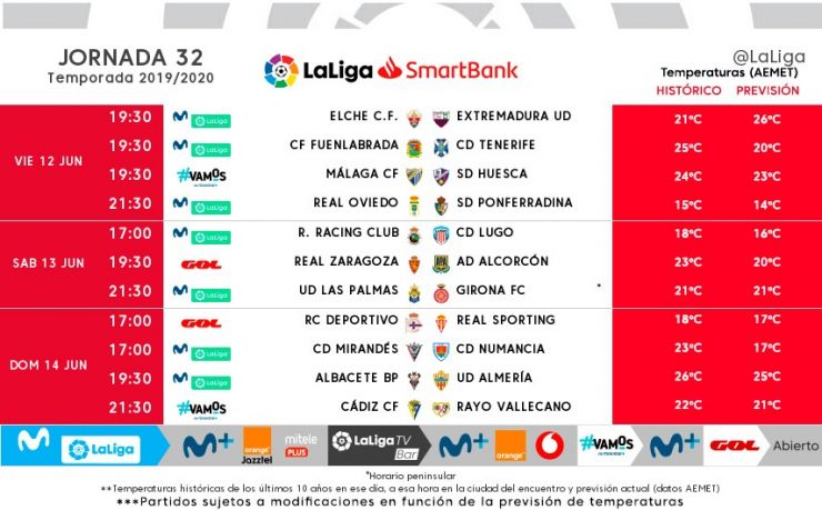 En Primera, mientras tanto, ese mismo jueves 11 se celebrará la 28ª jornada. El menú abrirá con el derbi sevillano en el Pizjuán entre Sevilla y Betis. Como principal novedad, los partidos a las 13 horas los fines de semana. Siempre, claro, que las temperaturas se mantengan y no suban. En caso de que lo hagan se trasladarán a las 17 horas.