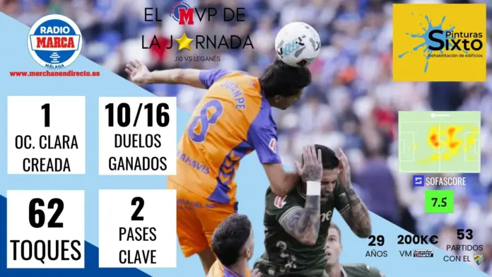 El partido del Málaga deja a muchos jugadores señalados y no para bien. En el plano ofensivo, más allá de Murillo, Dani Lorenzo y Juanpe es complicado elegir a nadie. El partido debe ser un antes y un después en la temporada del Málaga para demostrar cómo no debe jugar el equipo. Aún así, el ‘8’ volvió a demostrar cómo se puede resucitar de una mala situación con la afición. Por ello, Juanpe es el MVP de Pinturas Sixto del Pinturas Sixto trae el MVP del Leganés – Málaga de la jornada 10 de la LaLiga Hypermotion.