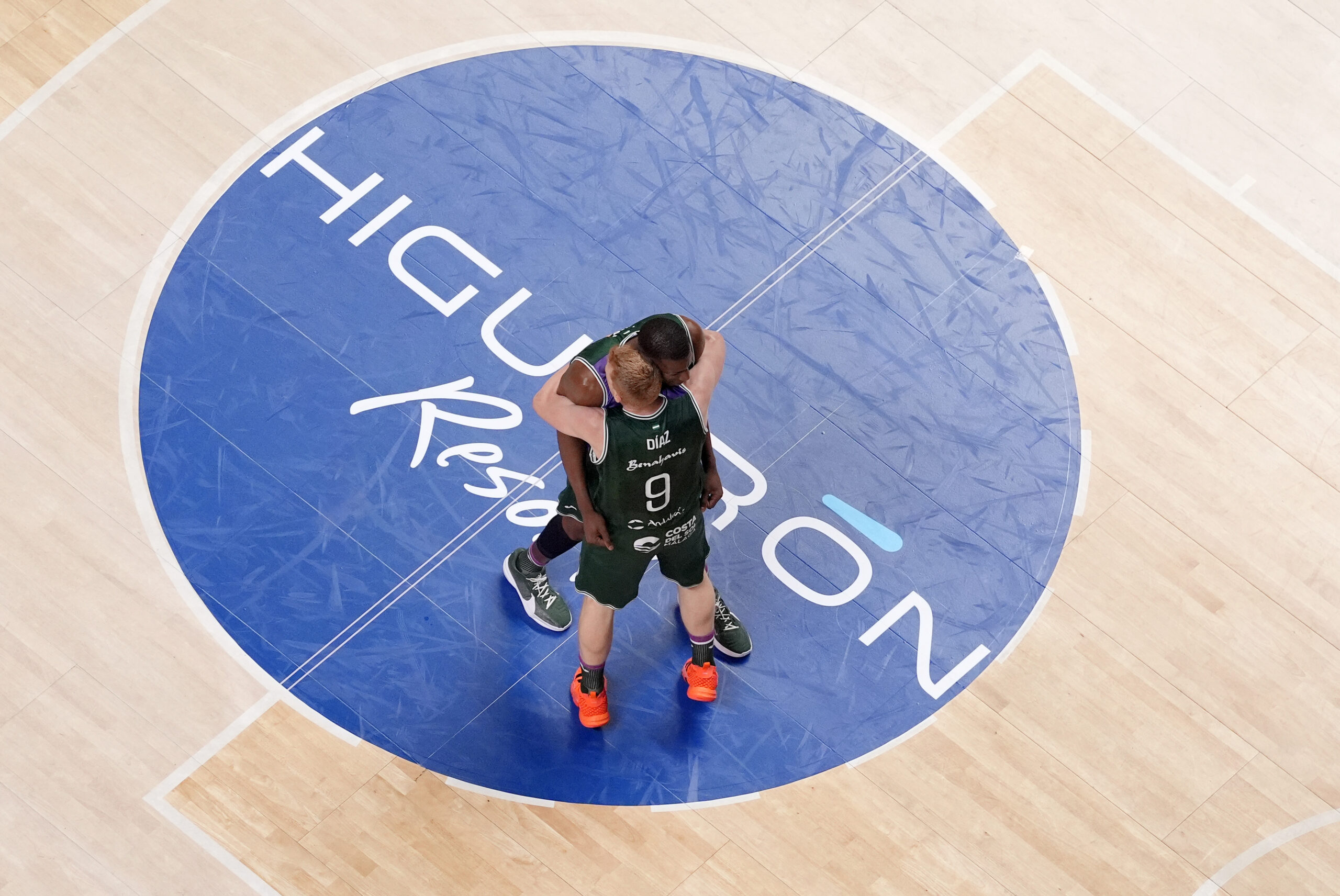Alberto Díaz y Will Thomas se abrazan tras conseguir la victoria frente a BAXI Manresa // ACB PHOTO / Mariano Pozo