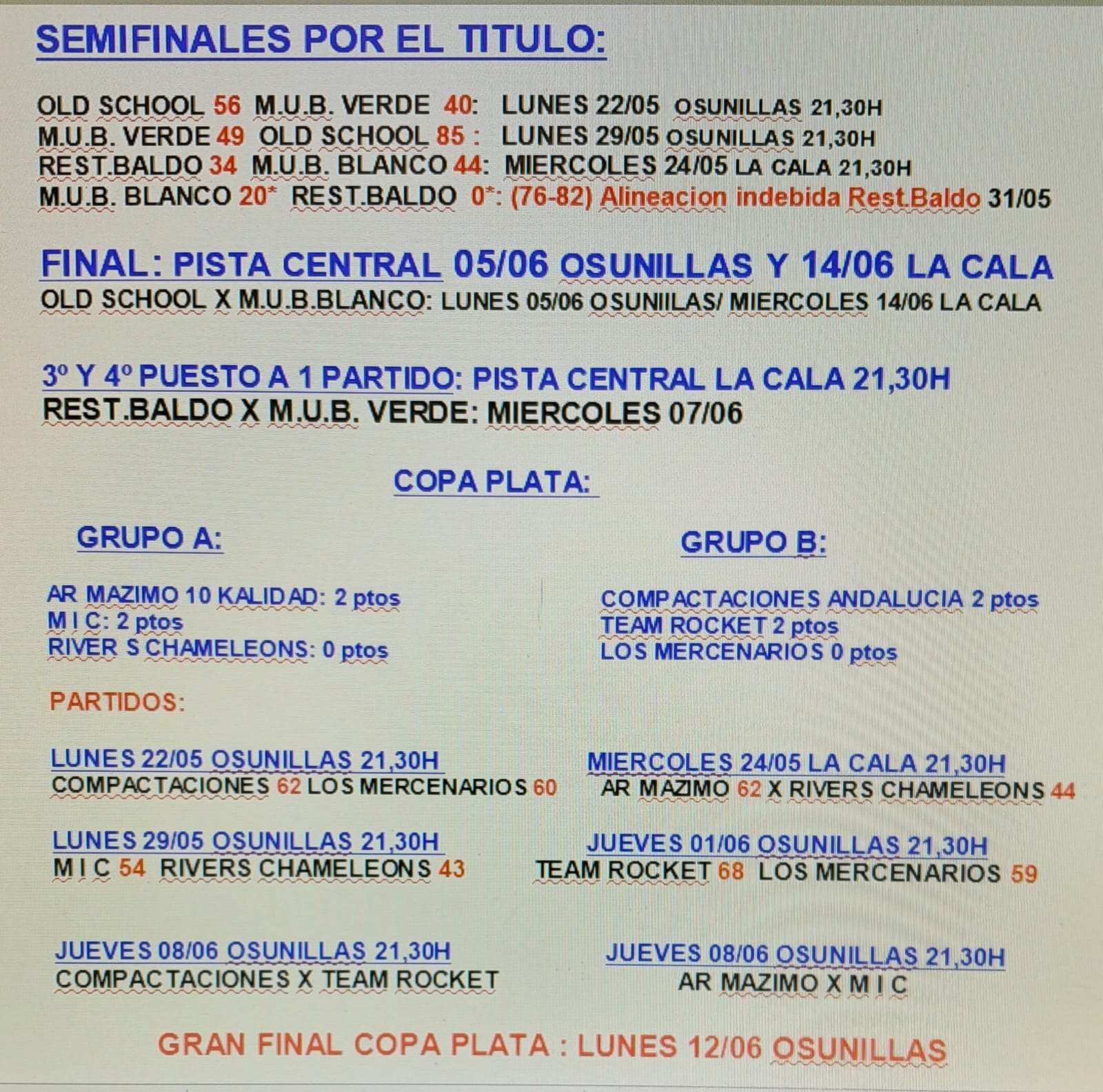 OLD SCHOOL Y M.U.B.BLANCO pasan a la final, y se espera que den 2 buenos partidos en la Pista Central tanto el próximo lunes 5 en Osunillas como el miércoles 14 en La Cala. Asimismo esperemos que lo den todo por el tercer puesto tanto Restaurante Pizzeria BALDO como M.U.B.VERDE el próximo miércoles día 7 de Junio en la Pista Central de La Cala.
