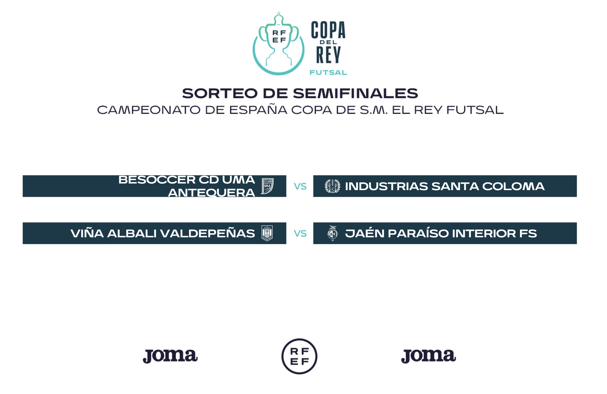 Ya es oficial: el UMA Antequera se medirá al Santa Coloma en la Final Four de la Copa del Rey de fútbol sala. Así lo ha confirmado la Real Federación Española de Fútbol dando a conocer el cuadro de las semifinales del K.O., que se disputará los próximos 14 y 15 de mayo en el Olivo Arena de Jaén. El otro emparejamiento enfrentará al Viña Albali Valdepeñas con el anfitrión, el Jaén Paraíso Interior.