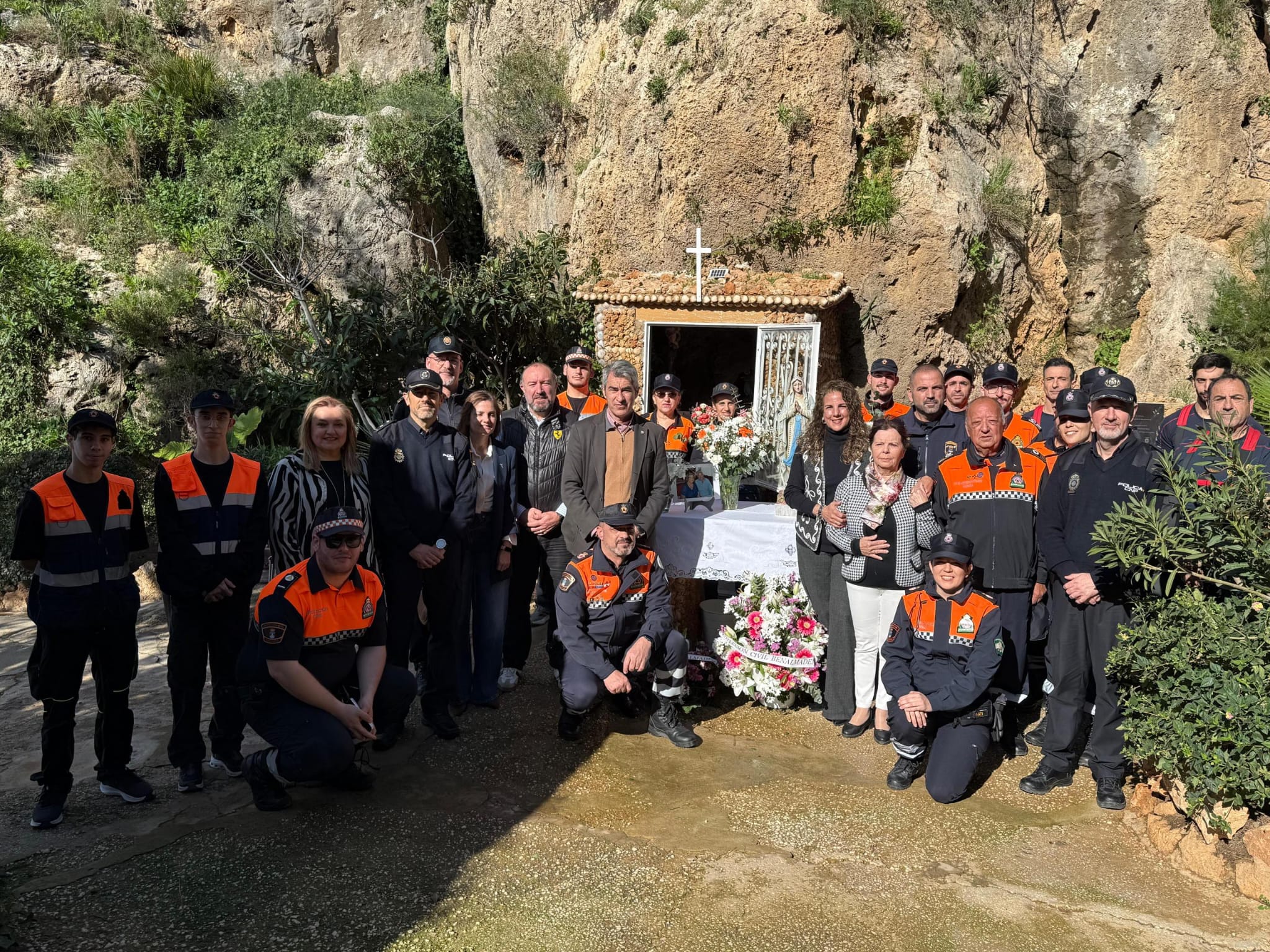 Miembros del equipo de la Corporación municipal han asistido a la tradicional ofrenda floral celebrada en la gruta de la Virgen de Lourdes, en Retamar, con motivo de la festividad de la patrona de la Agrupación de Voluntarios de Protección Civil del municipio.