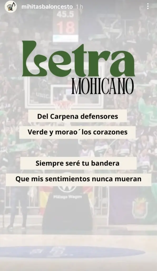 La banda de ‘Los Mihitas‘, en su cuenta de Instagram, propusieron esta semana ponerle letra a este cántico. Abrieron un concurso donde se recibían propuestas de la afición del Unicaja. La letra más original y que mejor se adaptase al compás de ‘El Último Mohicano‘, sería la ganadora. Ya ha habido decisión por parte de ‘Los Mihitas‘. Un joven aficionado del conjunto cajista, Nacho Muñoz Villares, ha sido el compositor de la letra ganadora. Como premio, además de darle color al Carpena de aquí en adelante, se lleva una camiseta de juego del Unicaja de esta temporada 2025/26.