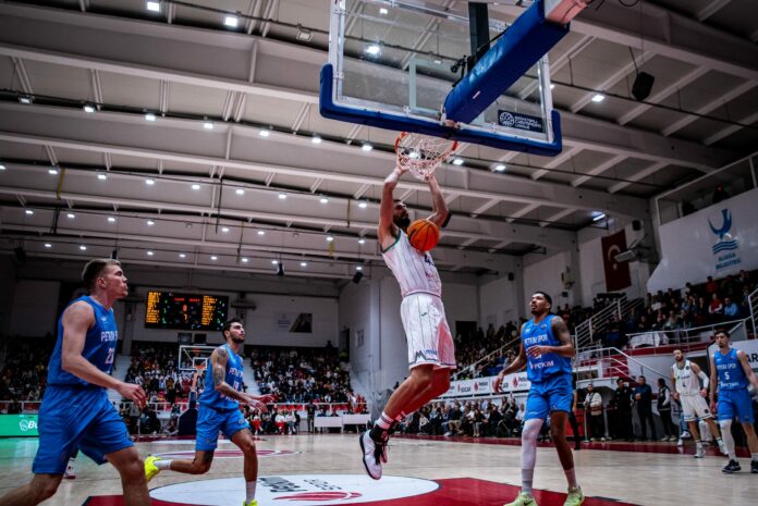 Una acción del duelo entre el Aliaga Petkimspor y el Unicaja // Foto: BCL photo.