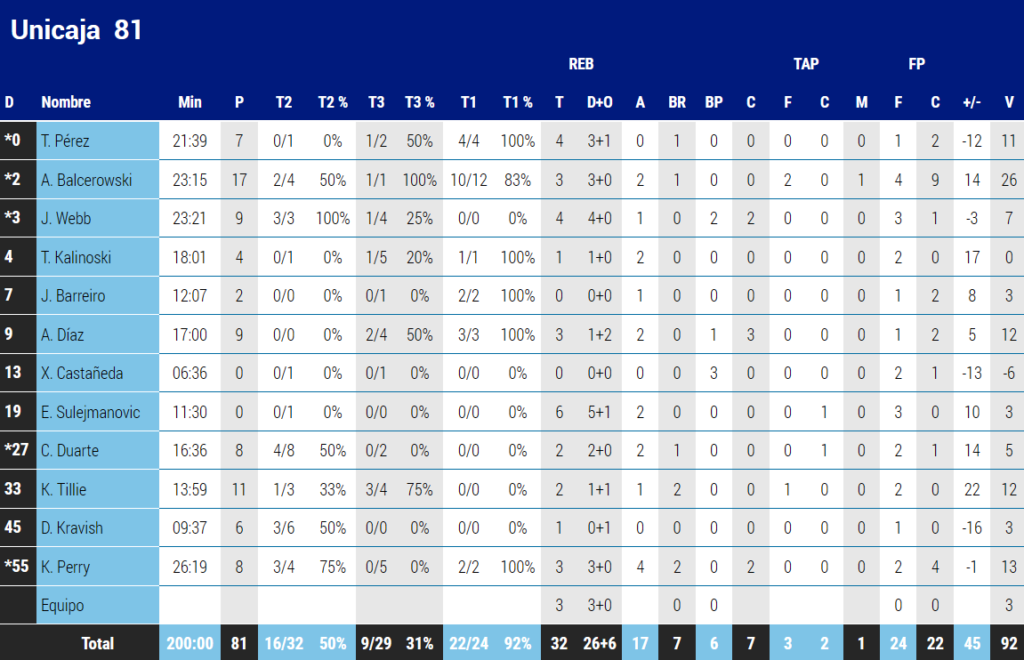 El Unicaja CB sigue invicto en este arranque de Liga Endesa. Jornada 2 con destino Gran Canaria en el que los de Ibon Navarro han sacado la victoria por 72-81. Balcerowski lideró el choque con 17 puntos y junto a Tillie (11) fueron los dos únicos jugadores en superar dobles dígitos para el cuadro malagueño. Alberto Díaz y Webb III siguieron con nueve puntos y Duarte y Perry con ocho. El ‘nuevo Unicaja’ empieza a carburar y las caras nuevas se asientan en el equipo. Estas son las estadísticas del Unicaja 72-81 Dreamland Gran Canaria.
