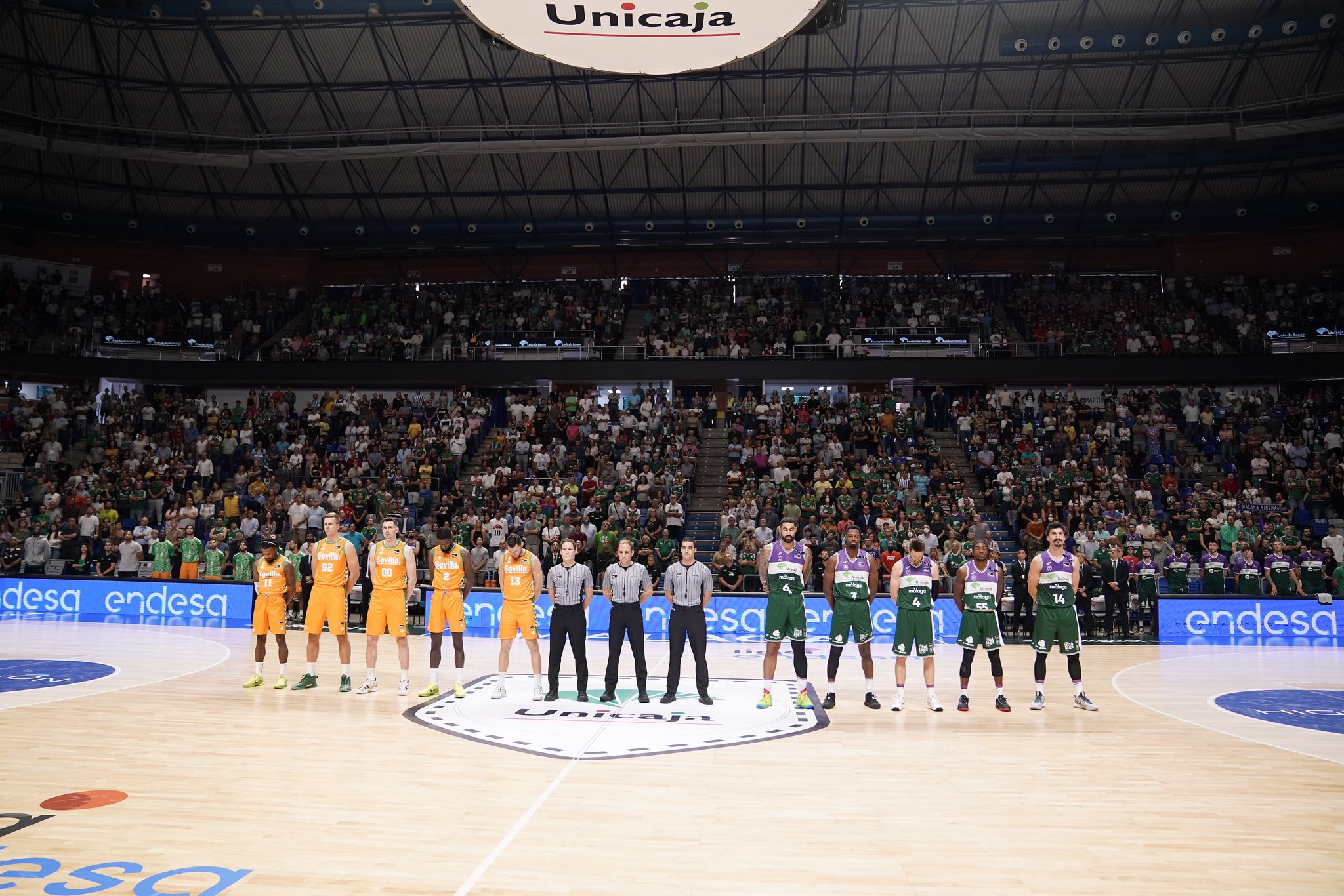 El trío arbitral con los quintetos iniciales de Unicaja y Betis | UNICAJABFOTOPRESS