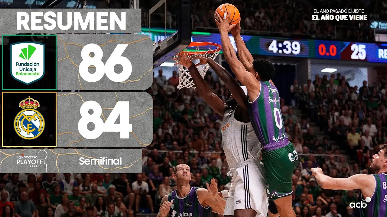 El Unicaja lo ha vuelto a hacer. Por segunda vez consecutiva en el Carpena, otra vez en domingo, infarto en el templo del baloncesto malagueño. En ambos, por suerte, resueltos a favor de los locales que, en este caso, mantienen la vida en la eliminatoria ante los blancos. 40 minutos de baloncesto en los que ha habido sangre, sudor y baloncesto. Así, revive el triunfo cajista en el tercer partido ante el Real Madrid.