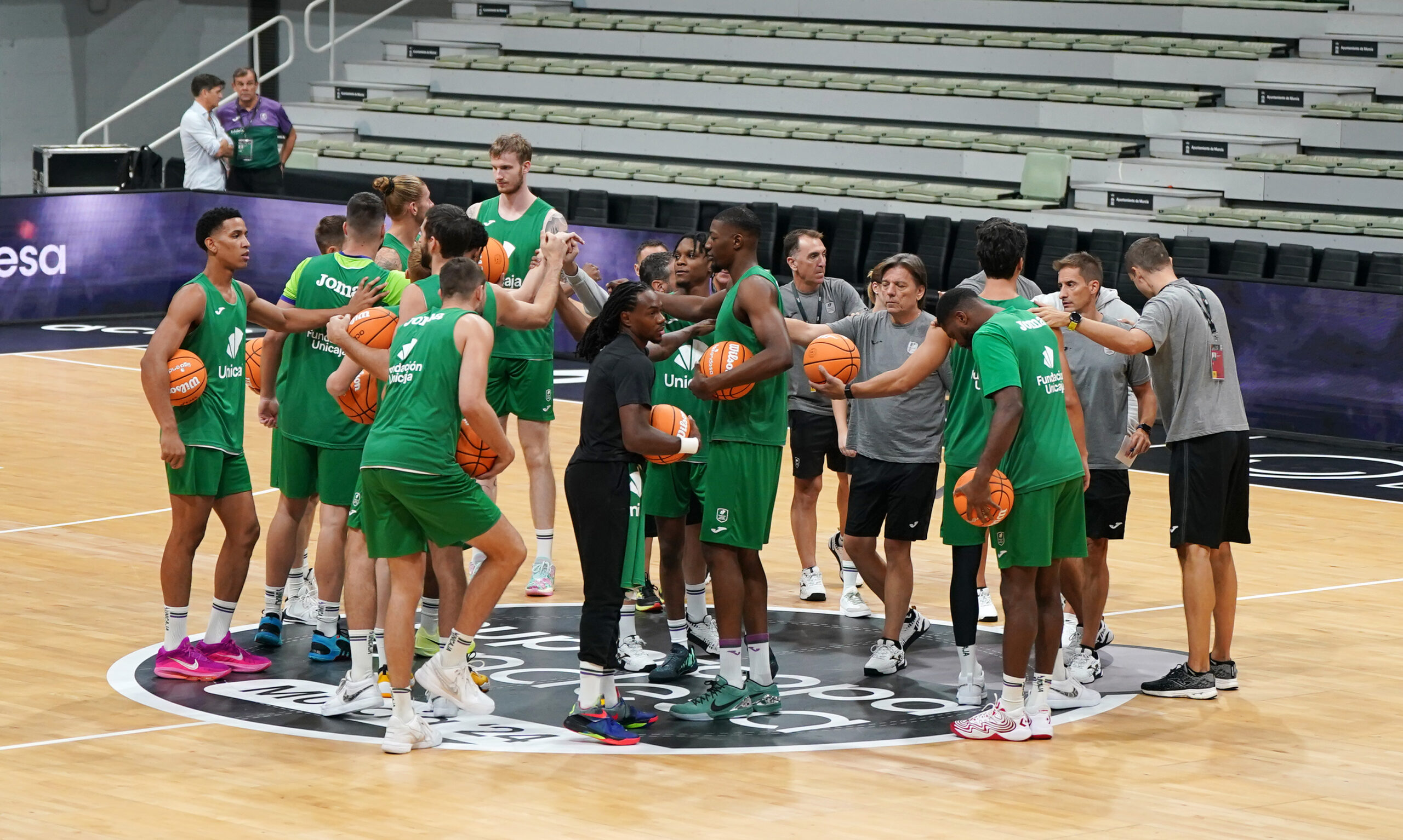 Los 14 jugadores del equipo de Ibon Navarro han aparecido sobre el párquet. Una plantilla completa que demuestra que el equipo malagueño aterriza en Murcia con muchas más bazas que el pasado curso. El equipo verde no pudo contar con pívots el año pasado. Este año, si así lo considera oportuno el técnico vitoriano, podría llegar a contar con un total de 3 pívots: Kravish, Sima y el recién llegado Balcerowski. Todos ellos se han ejercitado en la última sesión previa al partido.