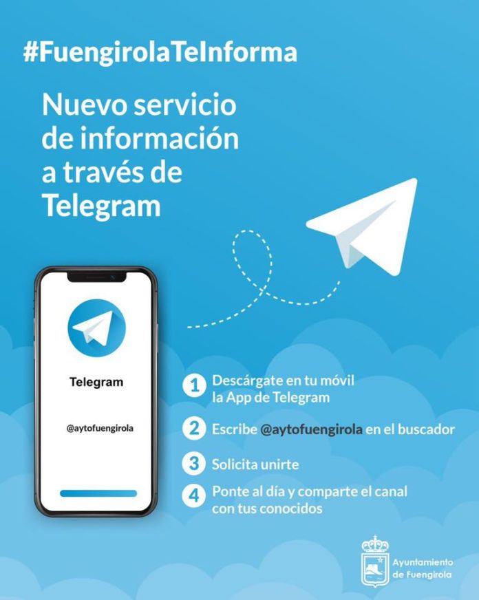 El Ayuntamiento anima a los fuengiroleños a suscribirse al canal municipal de Telegram, que supera los 750 vecinos inscritos. Este canal se puso en marcha a través del área de Innovación y Smart City del Ayuntamiento a mediados de mayo del pasado año. Este nuevo servicio, que es gratuito para ciudadanos y administración local, requiere de un registro previo por parte del vecino interesado en recibir las novedades, que puede realizar a través del enlace http://t.me/aytofuengirola.
