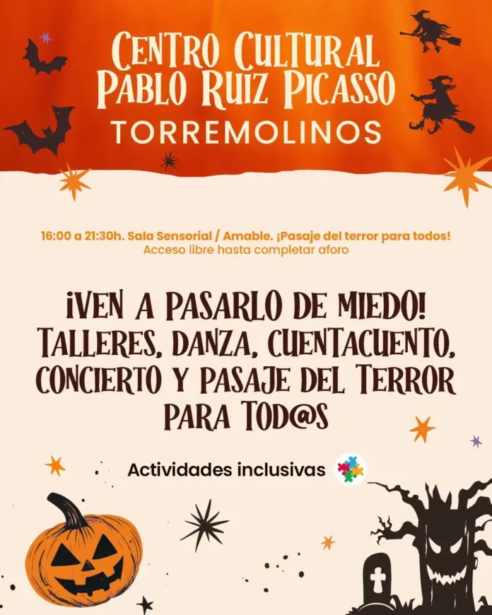 El Centro Cultural Pablo Ruiz Picasso se convertirá en el ‘Centro Encantado’ con motivo de Halloween. Desde el Ayuntamiento de Torremolinos se ha preparado una programación para toda la familia con distintas actividades como manualidades temáticas, proyecciones de cine de terror, conciertos o un campo de láser tag, entre otras.