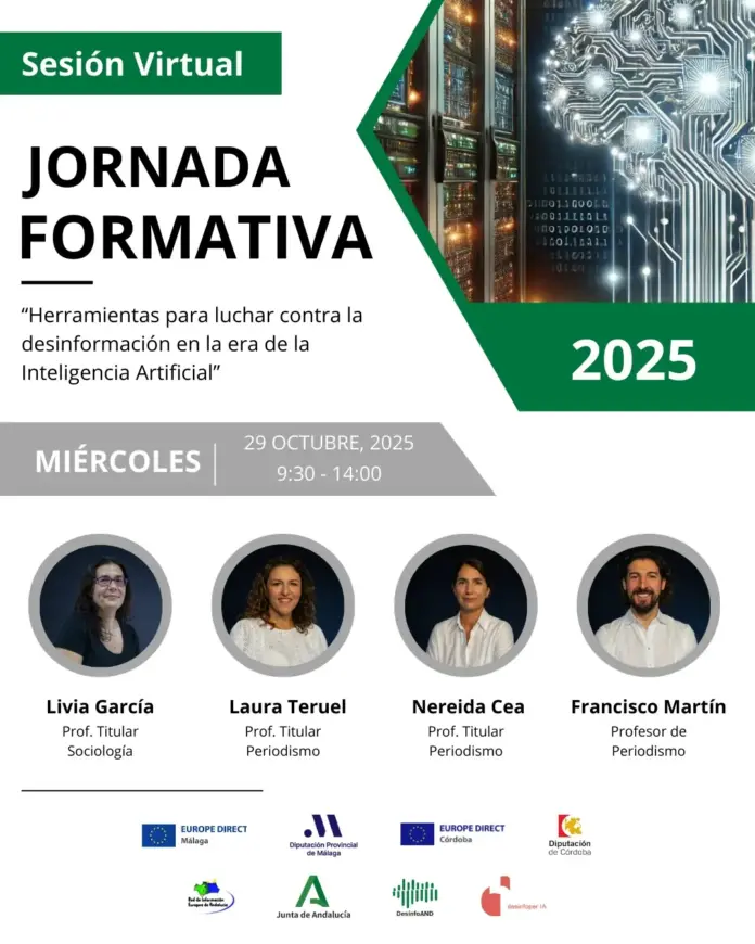 Este encuentro lleva por título ‘Herramientas para luchar contra la desinformación en la era de la Inteligencia Artificial’ y en él se aportarán datos de opinión pública y herramientas identificadas por la UMA para combatir dichas noticias falsas en las redes sociales en el marco del proyecto ‘Impacto de la desinformación en Andalucía: análisis transversal de las audiencias y las rutinas y agendas periodísticas’, financiado por la Junta de Andalucía y realizado por la Universidad.
