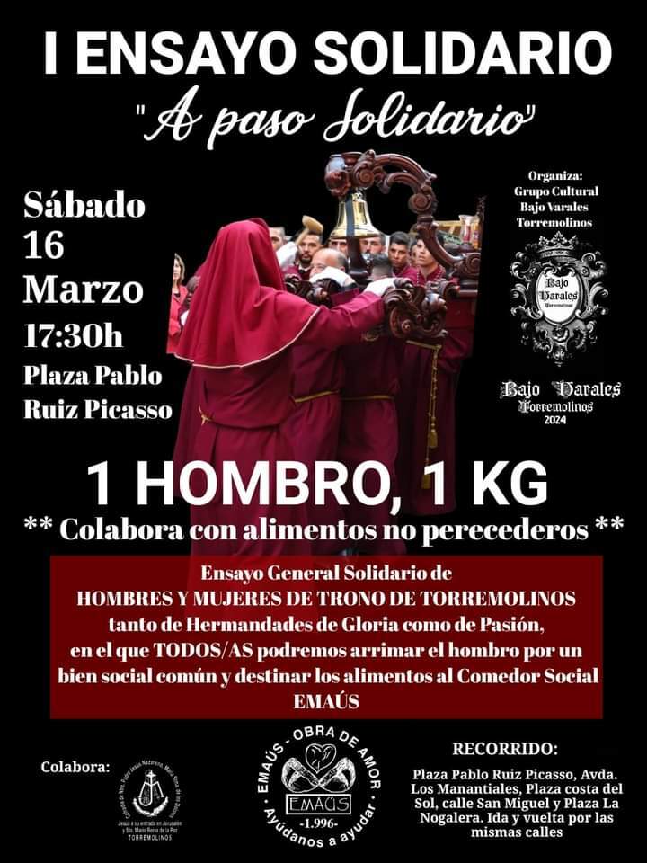 El grupo cultural ‘Bajo Varales’, con la colaboración de la Cofradía de Los Dolores, realiza el I Ensayo Solidario ‘A paso solidario’. Consistirá en un recorrido que partirá de la plaza Pablo Ruiz Picasso a las 17:30 horas y recorrerá varios puntos del municipio. Toda persona que lo desee, podrá depositar alimentos no perecederos en el trono, con el objetivo de que sean entregados a Emaús para su comedor social.