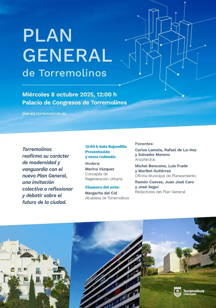 El acto será clausurado por la alcaldesa de Torremolinos, Margarita del Cid, quien ha aprovechado para invitar a la participación “para construir un documento de consenso colectivo, eficaz en sus determinaciones para mejorar la ciudad y, sobre todo, la vida de sus ciudadanos. El nuevo Plan General muestra nuestra decidida y firme apuesta por definir un futuro ilusionante para Torremolinos y todos sus vecinos y vecinas”.